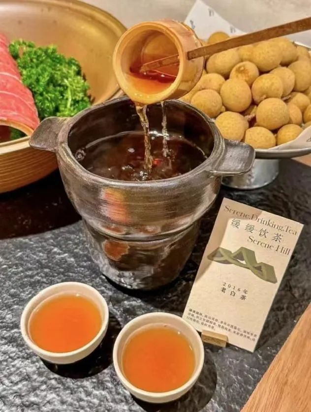 顾客进店落座后,餐桌上摆放有欢迎水果,紧接着,在顾客点餐的时候,店员还会端上白茶,并用木勺给顾客斟茶,把顾客初识门店的仪式感缓缓拉起,给后面的用餐做铺垫。
