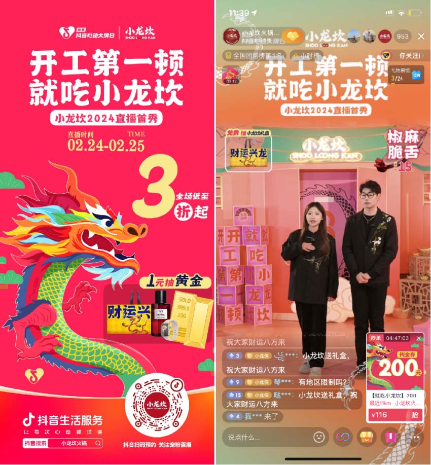 回顾“龙年第一顿”项目,小龙坎推行了近一年的“四统”策略成效显著。据小龙坎透露,新春期间,品牌曝光破20亿,GMV超4000万元,其中大场同比大涨54%,费效比下降31%,在抖音等推广主战场拉新率提升超600%。