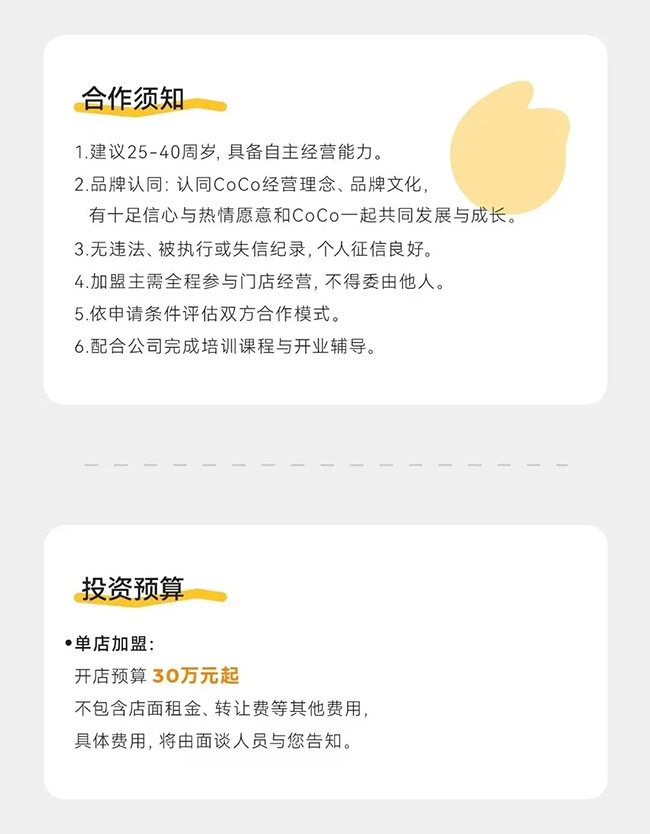 合作对象建议年龄25-40周岁,并将“认同CoCo经营理念、品牌文化,有十足信心与热情愿意和CoCo共同发展与成长”放在重要位置。