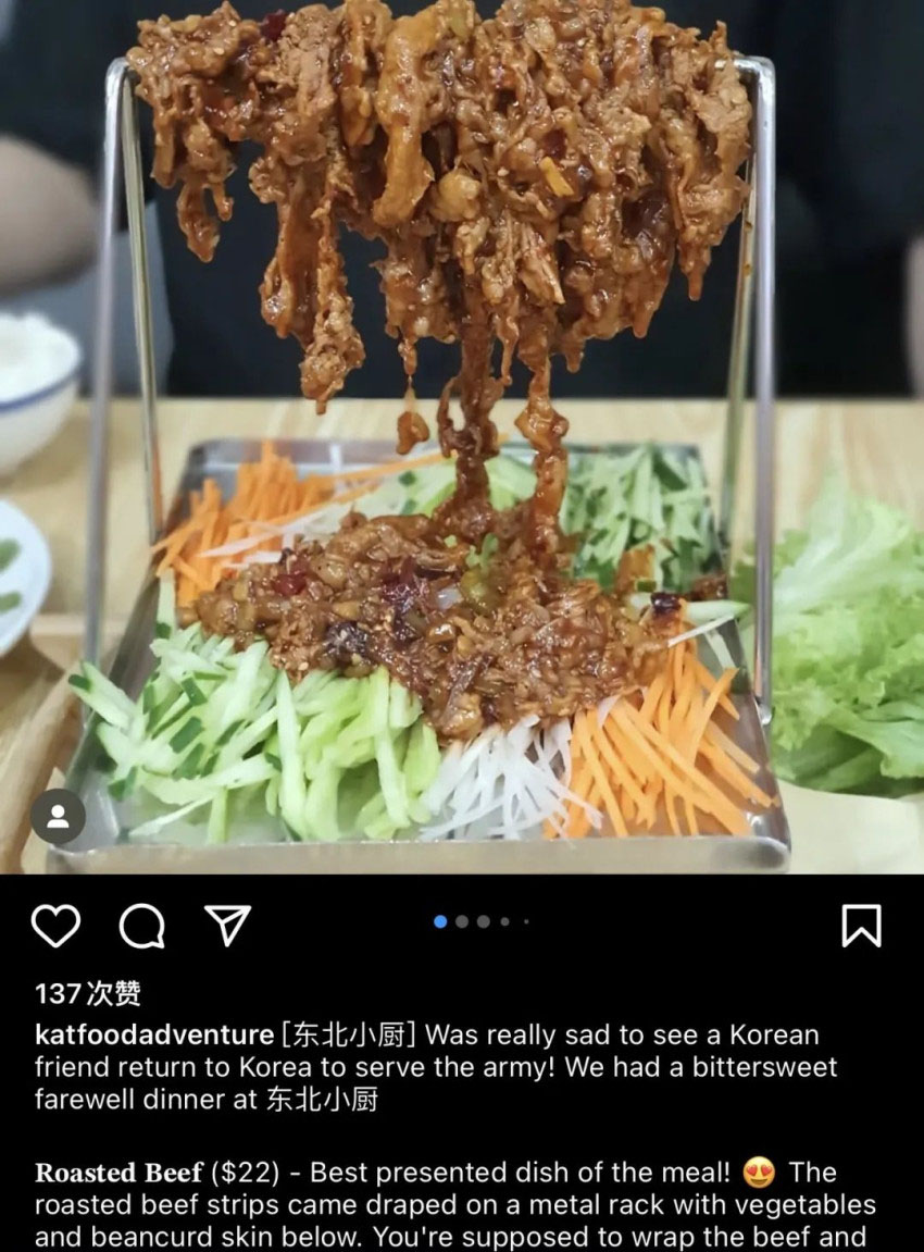 笔者和一些同在新加坡留学、工作的朋友们交流后发现,大家日常吃得最多的中餐类型就是东北菜。在社交媒体上,笔者也看到,东北餐厅的受众不止是中国人或者华裔,也有很多外国人慕名而来,甚至成为常客,大家普遍的评价是“Yummy food! Just a little spicy”。