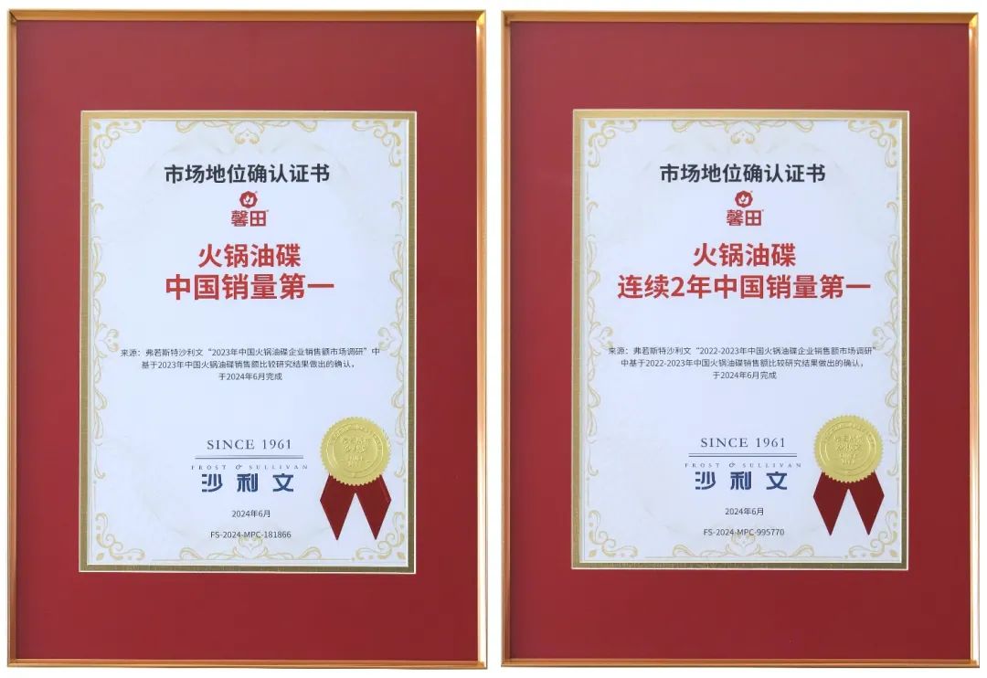 近日,馨田获得了全球增长咨询公司弗若斯特沙利文颁发的“火锅油碟中国销量第一”“火锅油碟连续2年中国销量第一”的双认证证书。