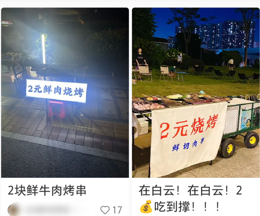 最近,社交平台涌现出一批分享自己摆摊日常的创业者,他们摆摊有一个共同特点——主打2元烧烤。