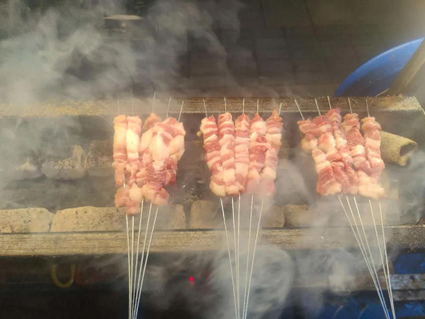 “下午5点开摊,人多的话一般9、10点就卖完了,肉一串能挣个七八毛,素菜能对半挣。”二胖如是说道。