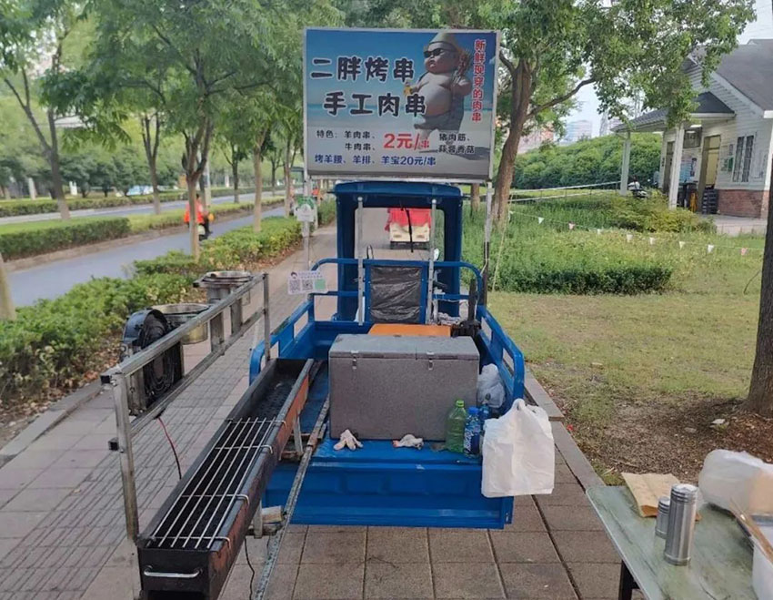 这些2元烧烤摊主打一个简易,一部推车,一台烧烤炉,再摆上一块写有“2元烧烤”的简易招牌,摆摊卖烧烤的生意便由此开启。
