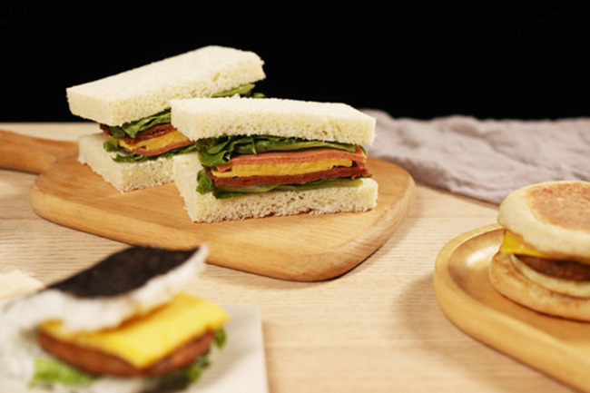 另一款植物帕斯雀牛肉火腿盒装三明治选用了具有高蛋白特点的星期零植物帕斯雀牛肉片和星期零植物火腿片,黑椒风味搭配咸香植物火腿片,加入滑蛋、清爽生菜和奶香沙拉酱,口感紧实,弹嫩适口。
